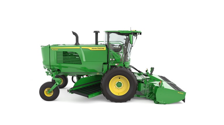 The John Deere merger attachment is compatible with the R500 roll conditioner platform only, as well as the W235M, W235R, W260M, and W260R Self-Propelled Windrowers.